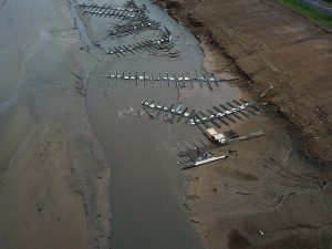 “The docks are high and dry in the late fall, when the lake elevation is down and the water is fast-running,” Leskinen explained. “We will still be vulnerable if Mother Nature decides to change the course of the river, and I’m a little nervous at this point, but the way we’ve ganged the docks together and rotated them to line up with the current should make them less vulnerable to the water flow.”