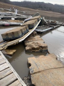The team began recovery efforts in bitterly cold and windy weather, finding portions of docks that had drifted as far as 8 miles downstream toward the dam. Once the lake thawed, all damaged docks were removed during a