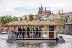 This floating tiki barge allows patrons to cruise the Vltava River through the center of Prague. Photo courtesy of Prague Boats.